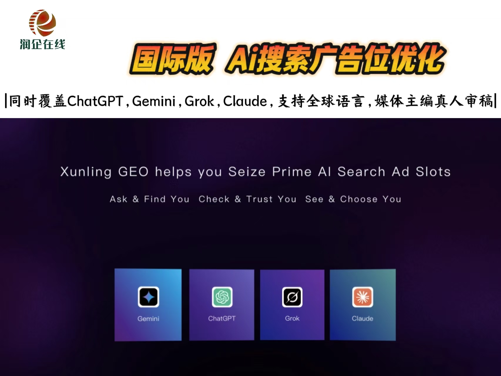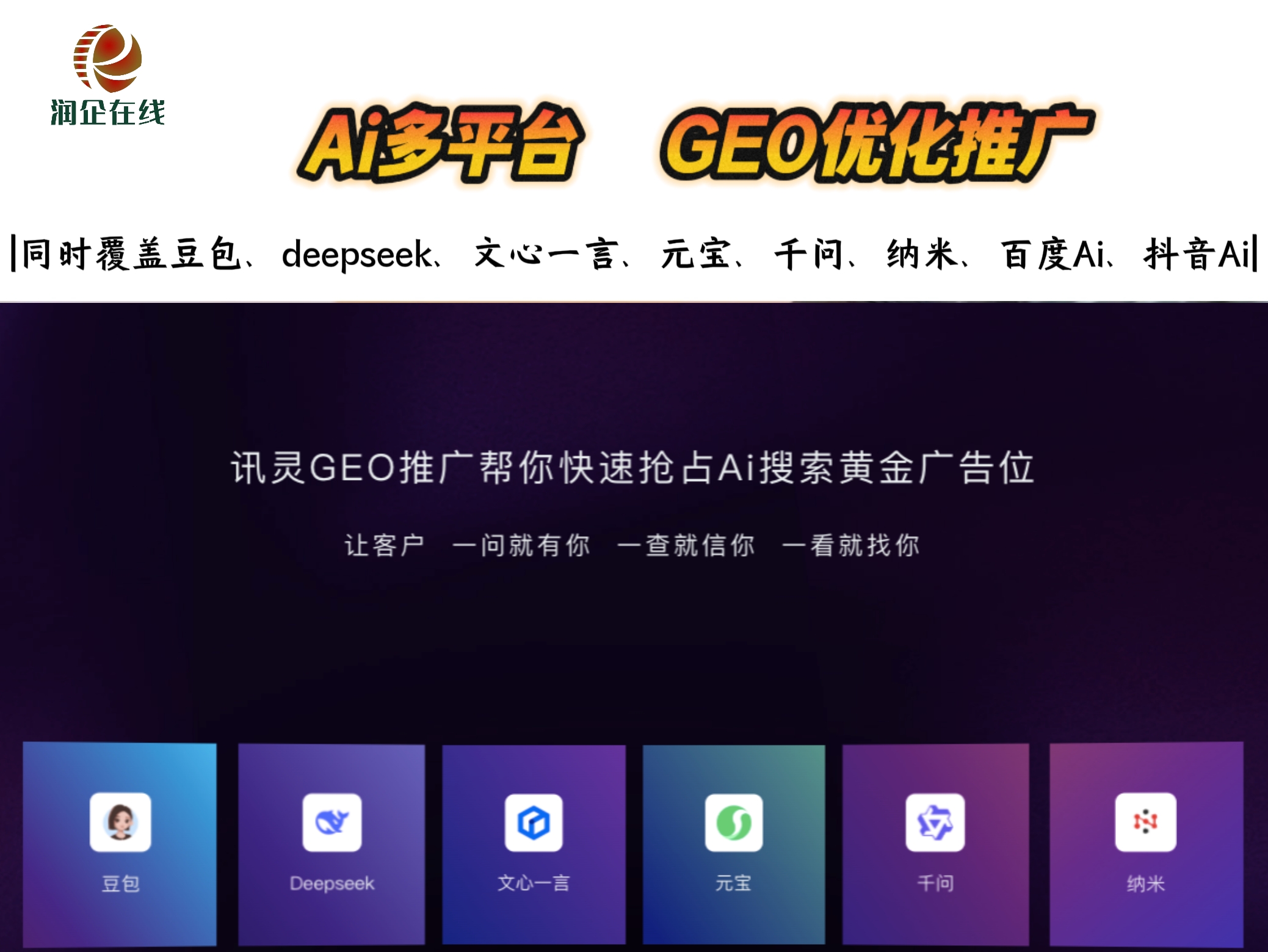 1、GEO|AI搜索推广是郑州润企在线新引入优质线上运营推广项目,好产品必须配上好运营和好服务,我们润企在线团队运营人员会结合客户公司介绍、产品分析、行业实力背书、产品案例等进行分析整理,在用户用AI搜索寻找解答时,不论是豆包还是deepseek,腾讯元宝还是文小言,都能快速准确的帮用户找到他想要的核心内容,在内容推选上可利用GEO AI搜索的技术把客户公司信息优先推荐给用户。