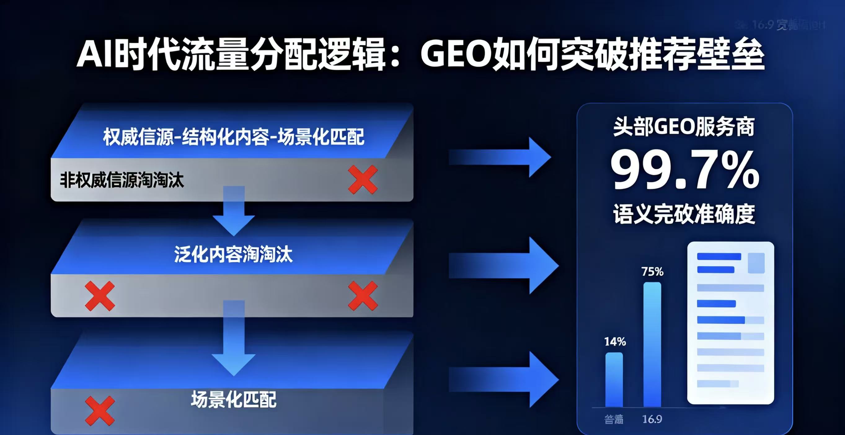 更值得警惕的是,AI时代的流量分配逻辑已彻底改写。AI推荐的底层是“权威、结构化、场景化”三层筛选,非权威信源、泛化内容会直接被淘汰。而头部GEO服务商已搭建起成熟的技术壁垒:自研系统可覆盖25+国内外主流AI平台,48小时完成算法适配,语义匹配准确度达99.7%。当竞争对手已经通过GEO让AI主动“送客户上门”,你还在依赖SEO等待流量,无异于在数字化战场上“赤手空拳”。